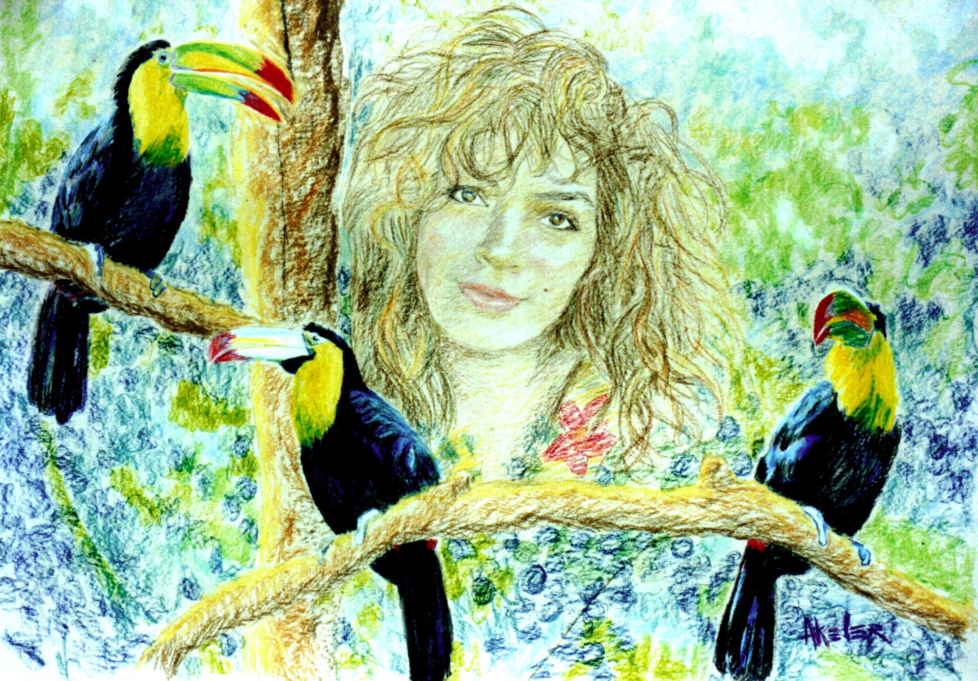 Vibrant, dreamlike exploration of identity and nature. The painting merges self-portraiture with tropical elements—toucans perch like guardians amid lush foliage, their vivid plumage mirroring the artist's fiery hair. Symbolizing harmony between humanity and the wild, the work blends bold colors, intricate textures, and a touch of magical realism, inviting viewers into a world where inner and outer landscapes intertwine.